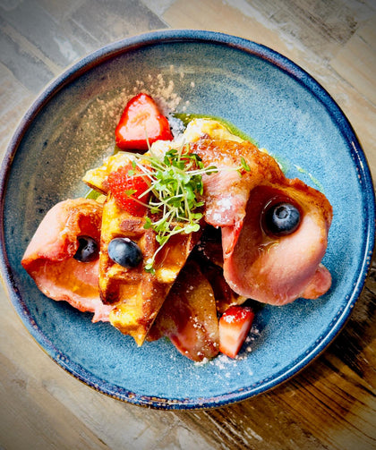 strawberries, blueberries, dry cured bacon, maple syrup